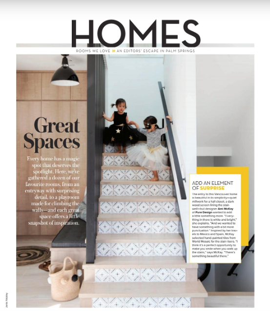 Our latest editorial in this month’s Western Living is a beautiful example of thoughtful design in an area that is often overlooked, the staircase. Designer Ami McKay of Pure Design chose a custom pattern from our terracotta specialist, Tabarka to elevate her client’s stair risers. In a house of bright whites and plenty of natural light, this stunning tile pops with its subtle design lending Spanish flare to this family’s home.